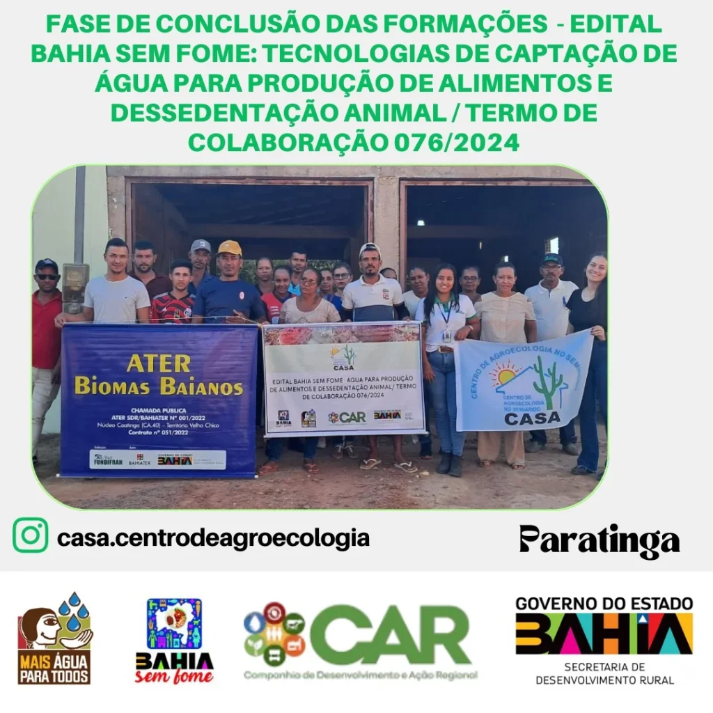 A implementação da tecnologia é bem mais que construção, pois envolve o processo de formação e troca de conhecimento entre as famílias, o CASA segue executando as últimas formações com os beneficiários/beneficiárias de Barreiro Trincheira Familiar pelo Termo de Colaboração 076/2024, celebrado pelo CASA e o Estado da Bahia, através da Companhia de Desenvolvimento e Ação Regional – CAR, empresa pública vinculada à Secretaria de Desenvolvimento Rural – SDR. O Sistema Simplificado de Manejo de Água (SSMA), um dos cursos ministrados no processo de implementação da tecnologia social de produção, se faz necessário para garantir a lida eficiente do recurso hídrico, visando efetivar uma boa produção de alimentação e criação de animais. Em Paratinga e Serra do Ramalho as últimas formações foram dois SSMAs, envolvendo atividades práticas com foco em auxiliar os agricultores e agricultoras em seu dia a dia a partir da conquista do Barreiro. Ainda restam duas formações a serem executadas, sendo um GAPA – Gestão de Água para Produção de Alimentos e um SSMA para Barreiro Trincheira. CASA: Conviver para Bem Viver no Semiárido.
